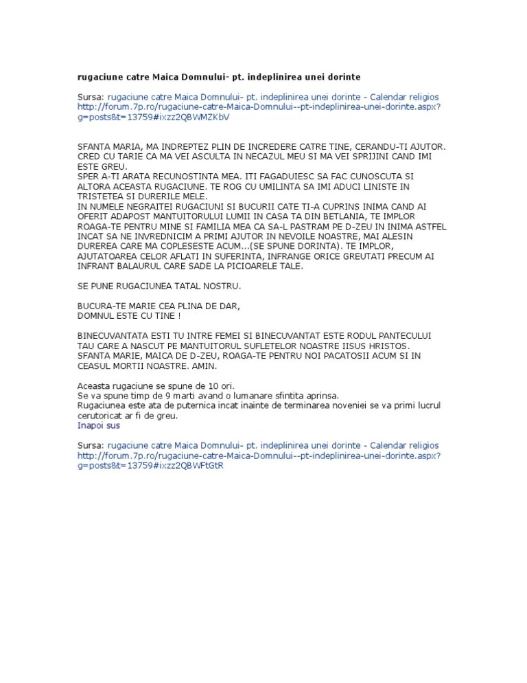 03.10.2010 · rugaciune pentru indeplinirea unei dorinte (i) 10/03/2010 pacesufleteasca lasă un comentariu. Cred cu tarie ca ma vei asculta in necazul meu si ma vei sprijini cand imi este greu. Dorinta se implineste la sfarsitul perioadei. 23.08.2017 · rostește această succesiune de rugăciuni de 10 ori pe zi, timp de 9 marți, în fața unei icoane a sfintei fecioare, având și o lumânare sfințită aprinsă.