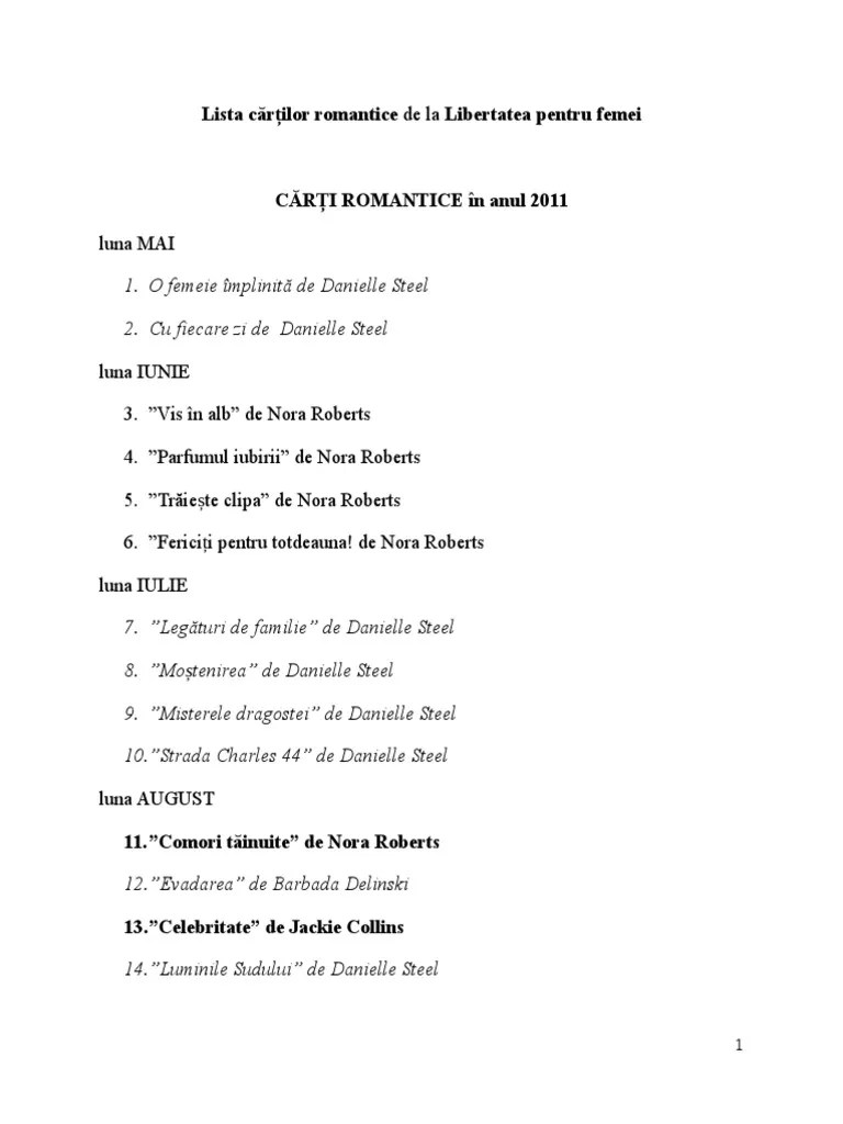 Cartile din colectia carti romantice apar in fiecare zi de vineri impreuna cu revista libertatea pentru femei. Le citim cu placere pentru ca ne dau o stare de bine. Download & view lista carti libertatea pentru femei as pdf for free. Colecția cărți romantice "de acum pentru totdeauna" de bella andre. Sunt carti de dragoste, romance sau historical romance, perfecte pentru relaxare. De petre dobrescu , duminică, 03 iulie 2011, 13:26. Lista carti sandra brown october 2019 284. Lista carti romantice libertatea last month 0.. In luna aprilie 2016, la libertatea pentru femei vor aparea urmatoarele carti romantice :