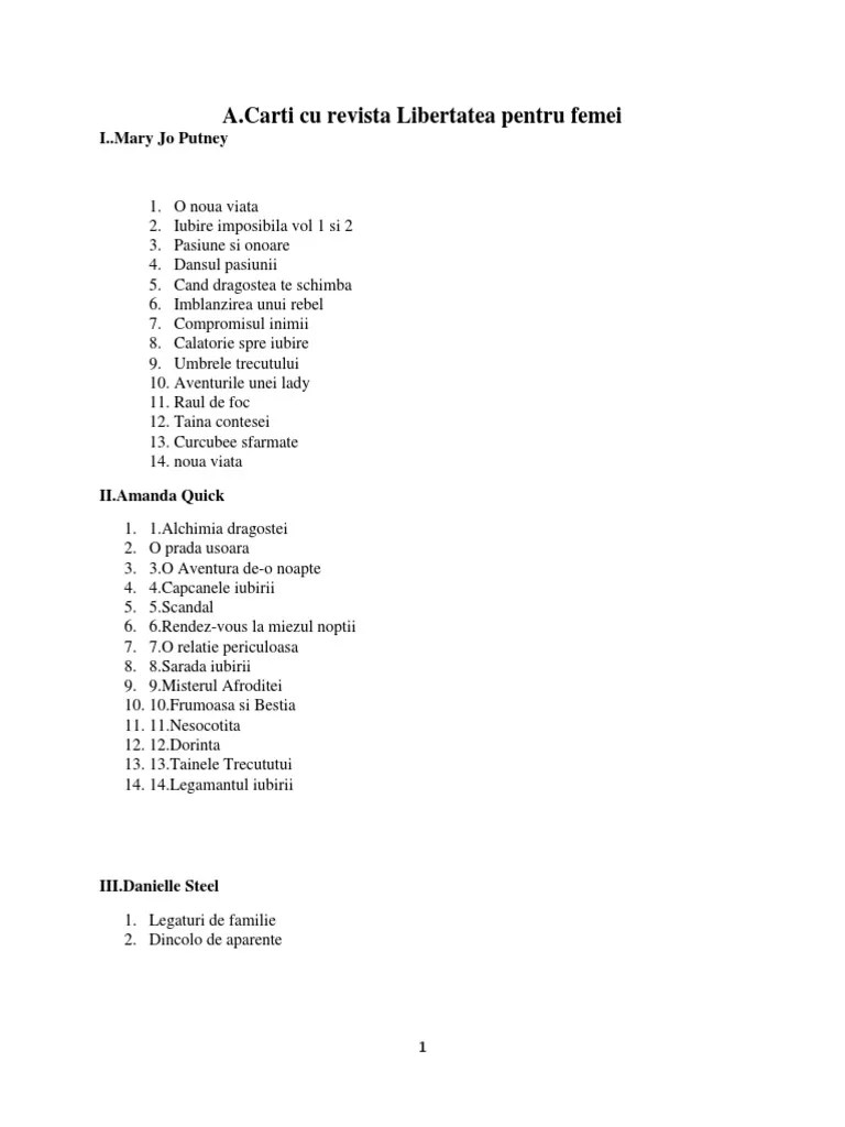 Download & view lista carti libertatea pentru femei as pdf for free. Vezi ce carti romantice apar in fiecare saptamana impreuna cu revista libertatea pentru femei. Le citim cu placere pentru ca ne dau o stare de bine. Jul 03, 2011 · danielle steel revine în colecţia cărţi romantice de la «libertatea pentru femei». De petre dobrescu , duminică, 03 iulie 2011, 13:26. Lista carti december 2019 625. Tocmai începuse primul ei job ca arhitect şi se îndrepta spre o carieră de succes. Colecția cărți romantice pe muchia dorinței de amanda quick. Click pentru femei 61 november 2019 68. Lista carti romantice libertatea last month 0. Pasiunea unui scoțian de suzanne enoch.